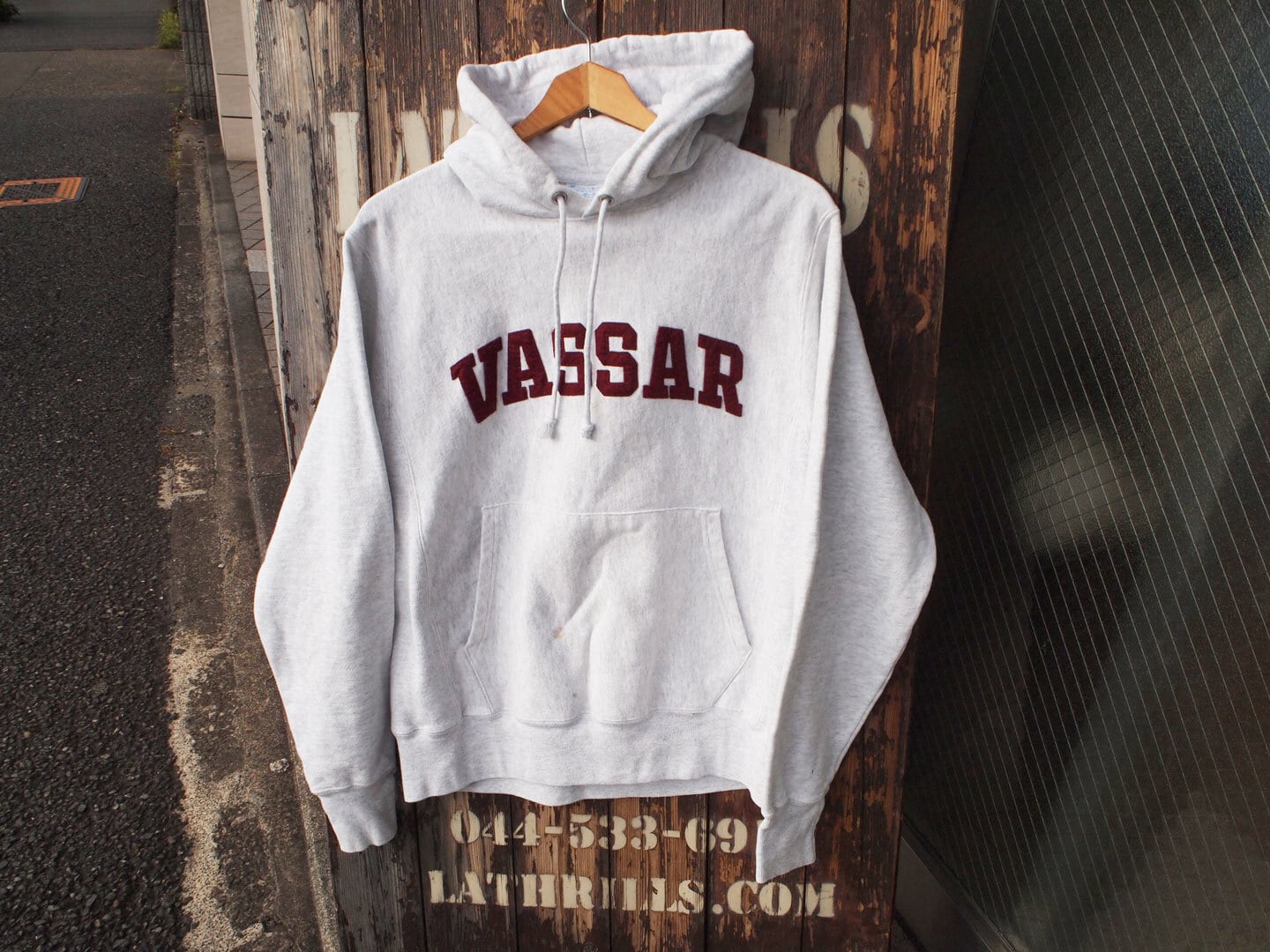 ■商品説明: USラインのChampionリバースウィーブスウェットパーカー。横織生地にサイドリブのゆったりとし肉厚ボディです。ニューヨークヴァッサー大学のカレッジもの。