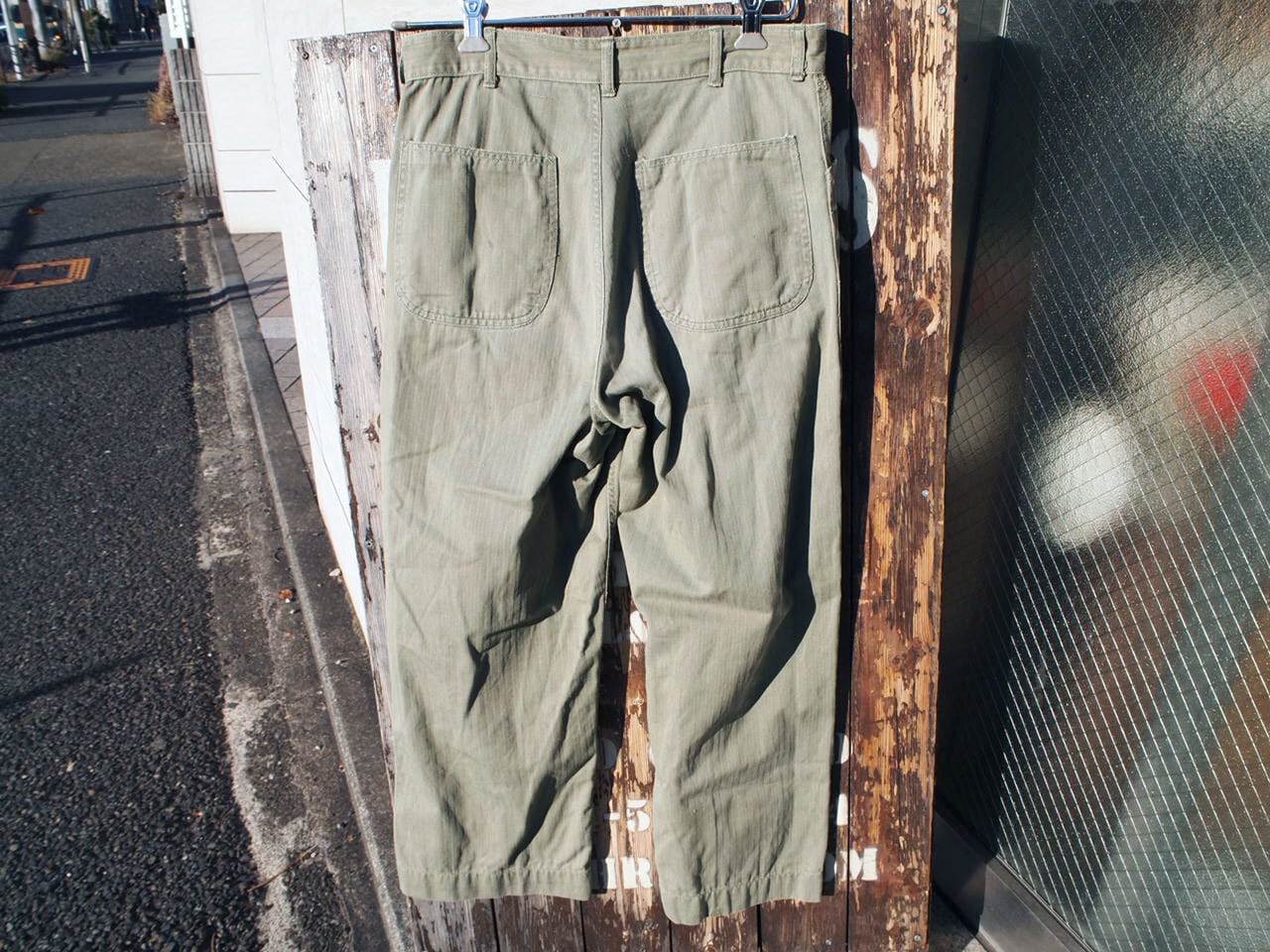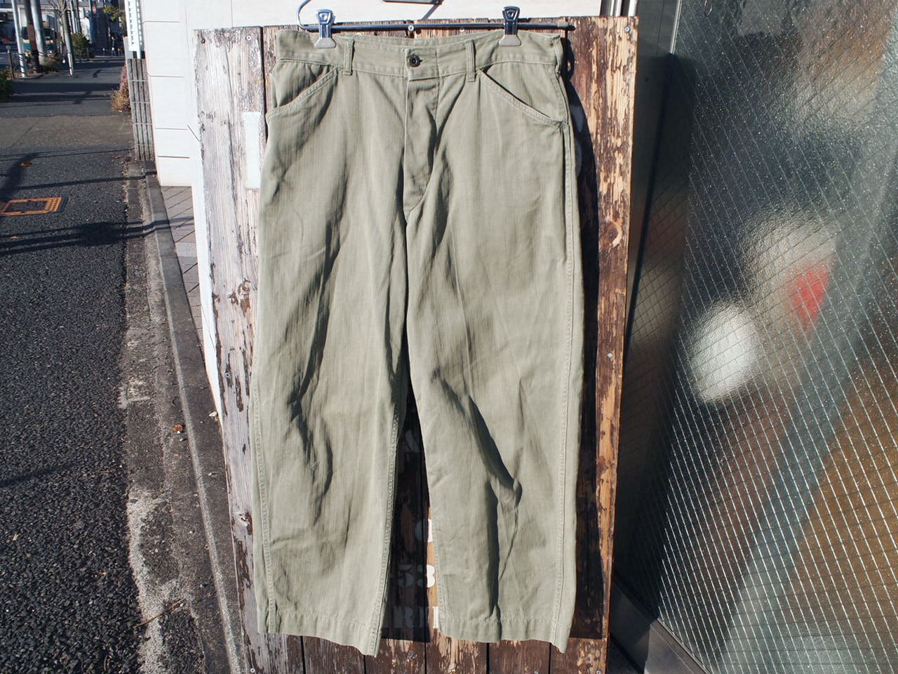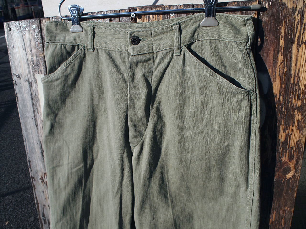 ■コメント:1940年代にWW2時、太平洋戦争などでアメリカ海兵隊にて官給されたヘリンボーンツイル素材のP-41パンツ。フェードしたコットンヘリンボーンツイル、ボタンフライ式でU.S.MARINE CORPSの刻印の入ったメタルドーナツボタン使用。