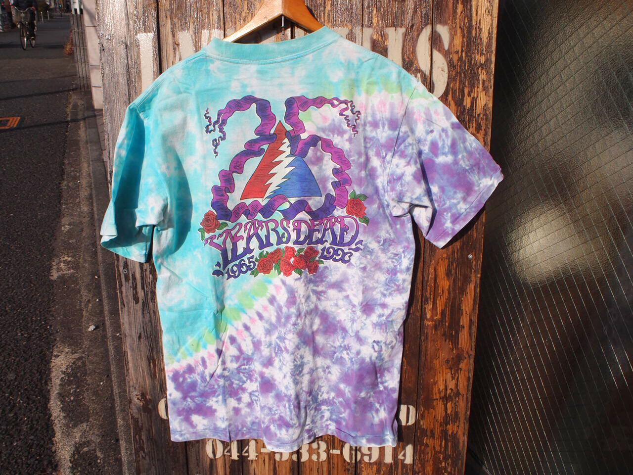 ■商品説明:90s Grateful Dead オールド グレイトフルデッドのTシャツ。 「Skull&Rose」がプリントされた珍しい染め方のタイダイTシャツ。バックには25周年記念のプリント。Brookumのオフィシャルもので袖シングルステッチのUSA製。