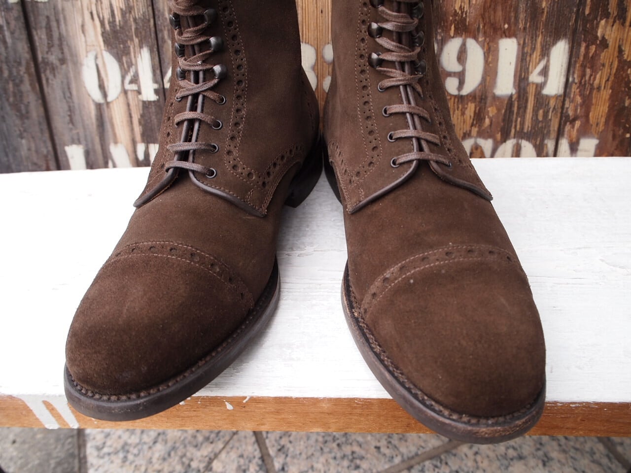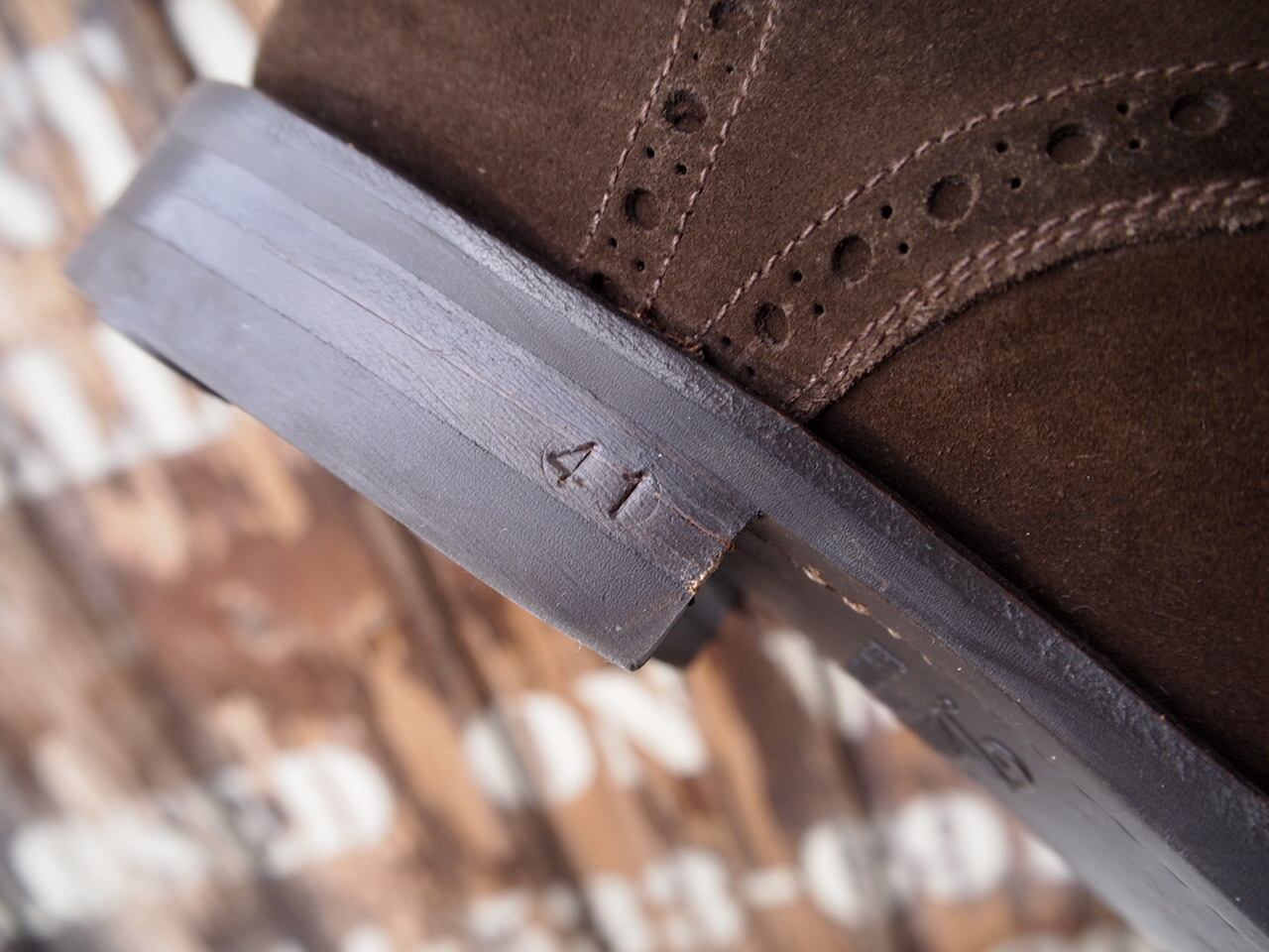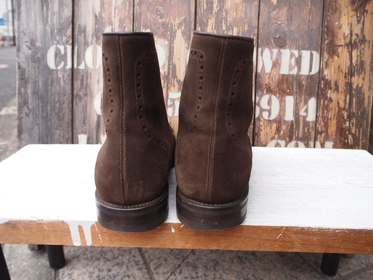 こちらはしなやかなスウェード素材のパンチド キャップトゥのブーツです。ソールはイギリス製のダイナイトソール。グッドイヤーウェルテッド製法。