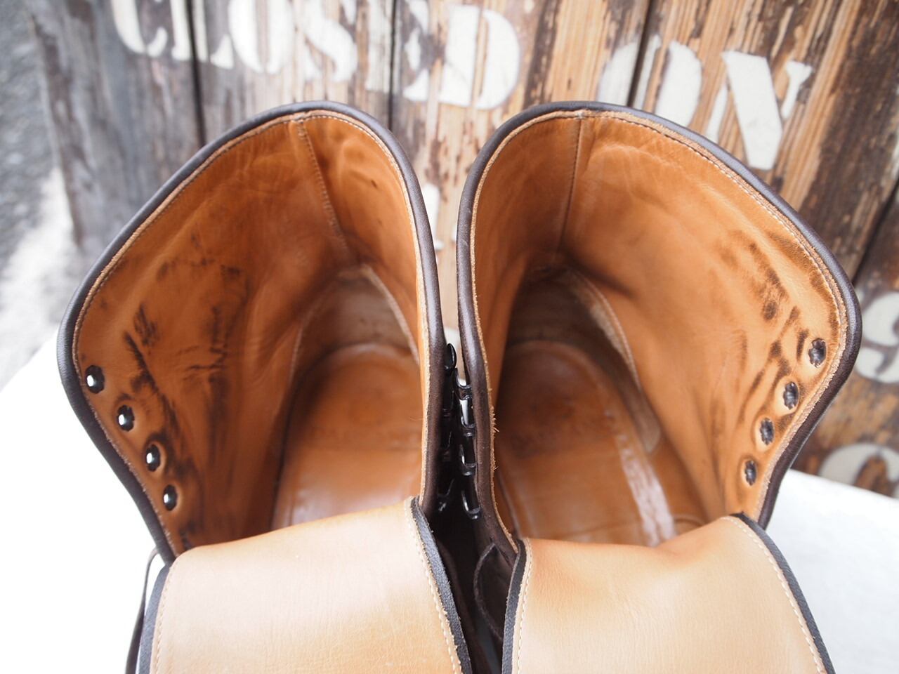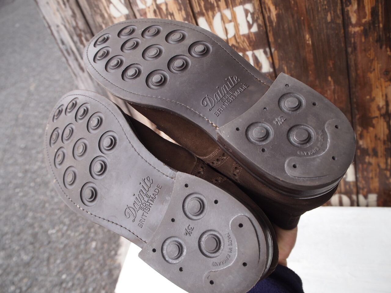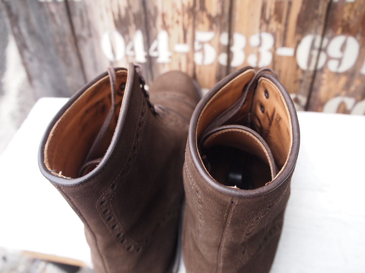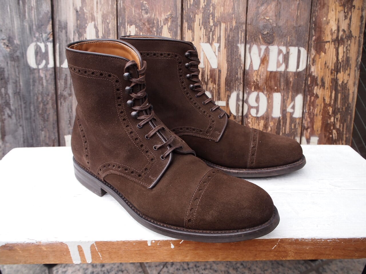 こちらはしなやかなスウェード素材のパンチド キャップトゥのブーツです。ソールはイギリス製のダイナイトソール。グッドイヤーウェルテッド製法。