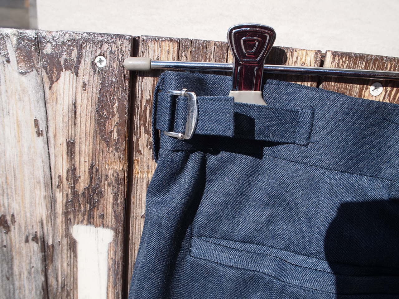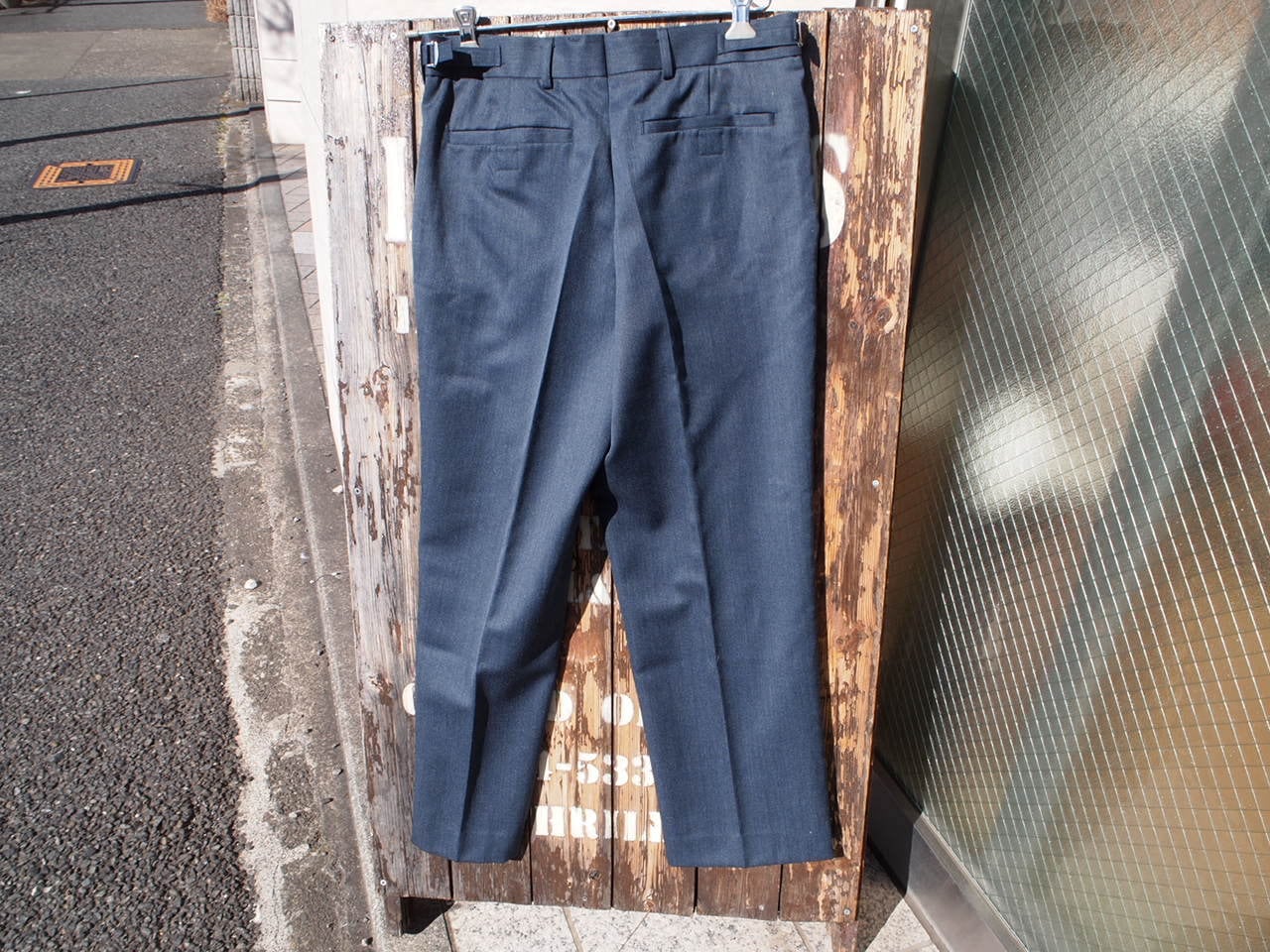 サラッと肌触りの良いウール×ポリエステル混合の生地を使用。ジッパーフライ仕様にウエストアジャスター付き。