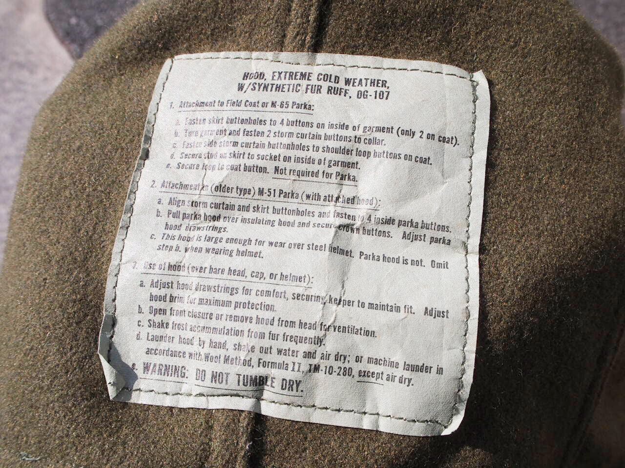 ■商品説明:1980年代の『HOOD, Extreme Cold Weather W/SYNTHETIC FUR RUFF OG-107』 M65用のアクリルファー付のフードです。